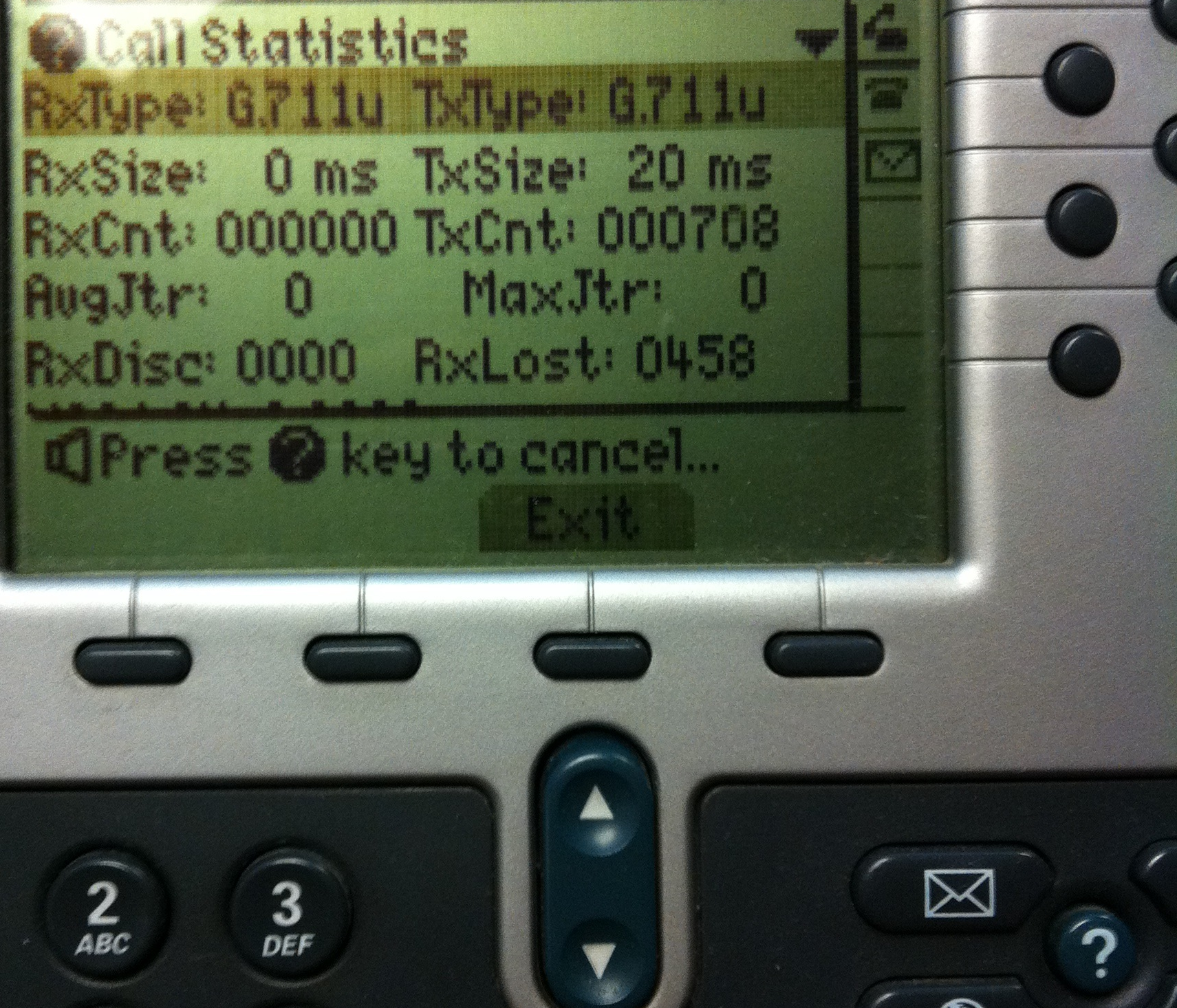 A good place to start on a no audio issue like this is to make use of the Question Mark button located on most Cisco phones. In this case I was dealing with a 7960 (don’t judge me) and just clicking the Question Mark button twice pulled up stats for the conversation.  Most notably, I could see that the transmit packets were incrementing, but the receive packets were not*. Newer phone models like the 69/8900 series hide this information in some other menu which isn’t entirely obvious, but just check the documentation to see how to pull up phone call stats. You can see in the photo below the type of useful information you can get – note the Question Mark key is in the bottom right of the picture.