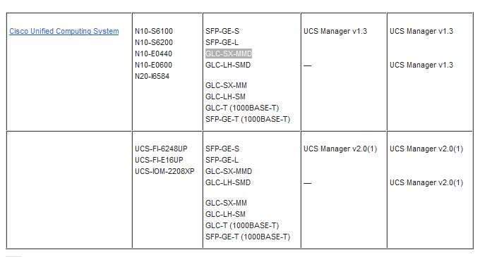 *if you refer to the Data Sheet for the 6200 Series Fabric Interconnects found here you won’t see the GLC-SX-MMD listed. My VAR sent me over the screen shot below to assuage my fears after TAC initially told me the SFP wasn’t supported. I have yet to locate the original doc on Cisco’s website, if you have a link, please feel free to post it.