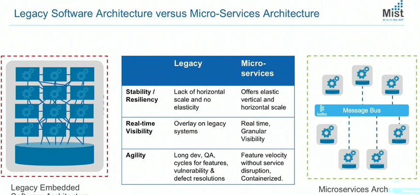 Cloud-based micro-services architecture. This modern approach to building systems is part and parcel of what many cloud companies have been doing with their software architecture over the last few years. Instantiating distributed services and leveraging APIs between these services is foundational to providing the kind of resiliency and redundancy cloud makes possible and Mist credits this architecture with how they are able to push out new features, fixes, and services weekly without causing any data plane outages for customers.