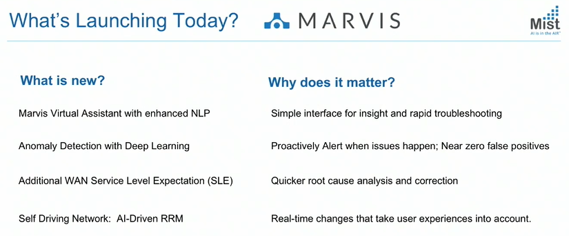 And the analytics don’t stop with just ticket opening – MARVIS (Mist’s AI) is getting several feature enhancements focused on improving the troubleshooting process, reducing analysis time, and improving RRM.