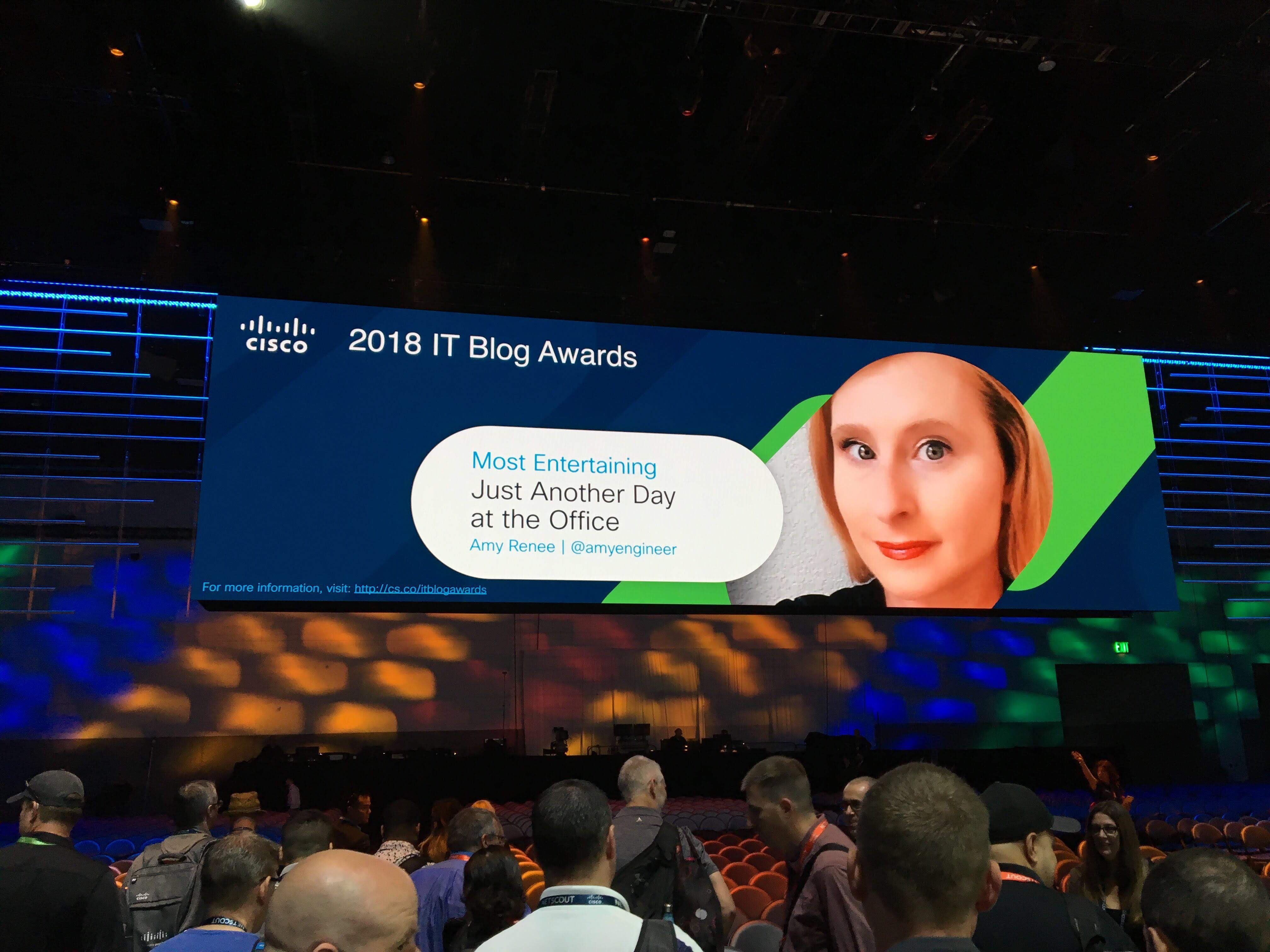 that this very blog received! As Cisco 2018 IT Blog Award winner for Most Entertaining, yours truly had her big screen moment! I couldn’t be more thankful for each of you who took the time to vote! Thanks for reading along, laughing along, and sharing along with my adventures, snark, and bits of wisdom. You all rock, and obviously have the best taste.